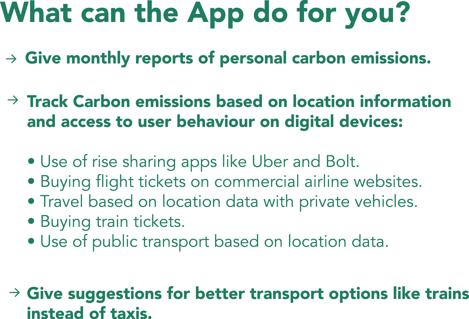 The home screen contains all carbon tracking information at a glance. The app also offers options to log trips manually, and save commonly used transport methods.